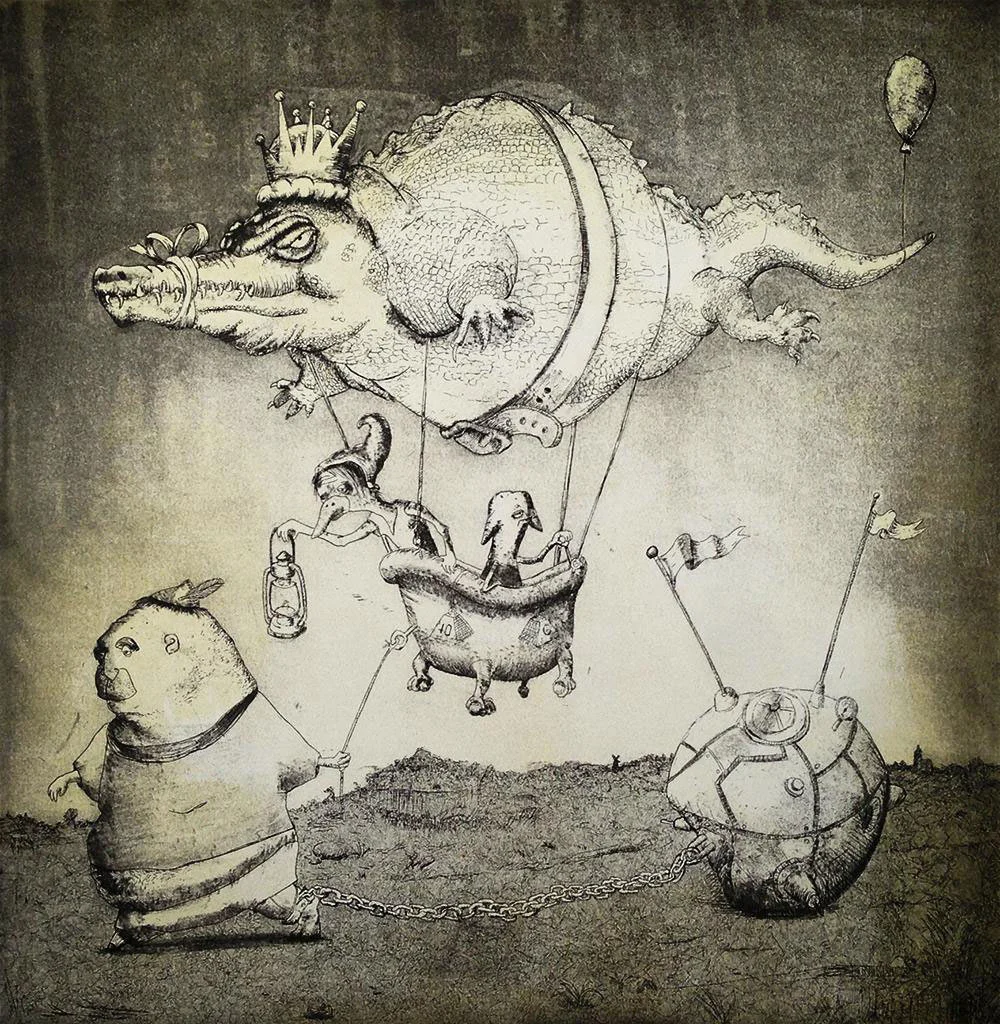 Highpoint co-op artists Johanna Winters and Don Krumpos present The Sideshow, a new collaborative series of etchings that depict a ragtag band of misfit performers who meander through ambiguous storybook scenery. This is the first collaborative effort between Winters and Krumpos, and is a melding of their artistic approaches to printmaking. The whimsical imagery in this print series hearkens back to the children's book illustrations of the artists' formative years, but this time with a more mischievous (and cynical) spin.