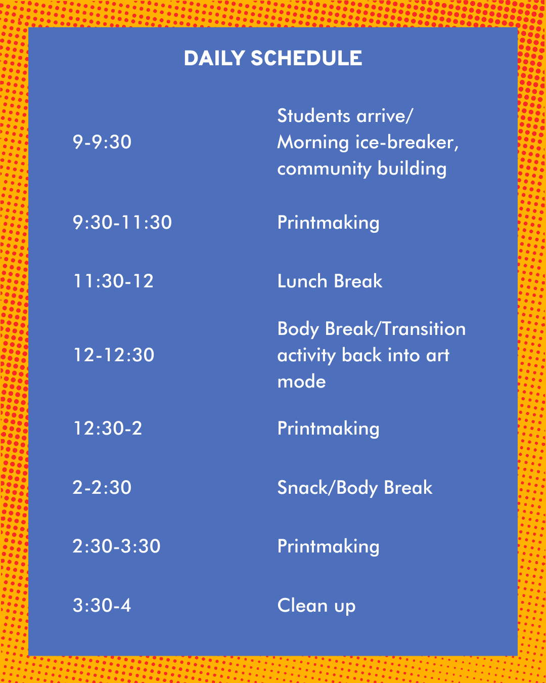 All camp sessions will have 2 instructors facilitating, with support from Highpoint’s Education Programs Manager and Education Programs Assistant. Instructors are experienced teaching artists who have taught all ages and printmaking techniques.