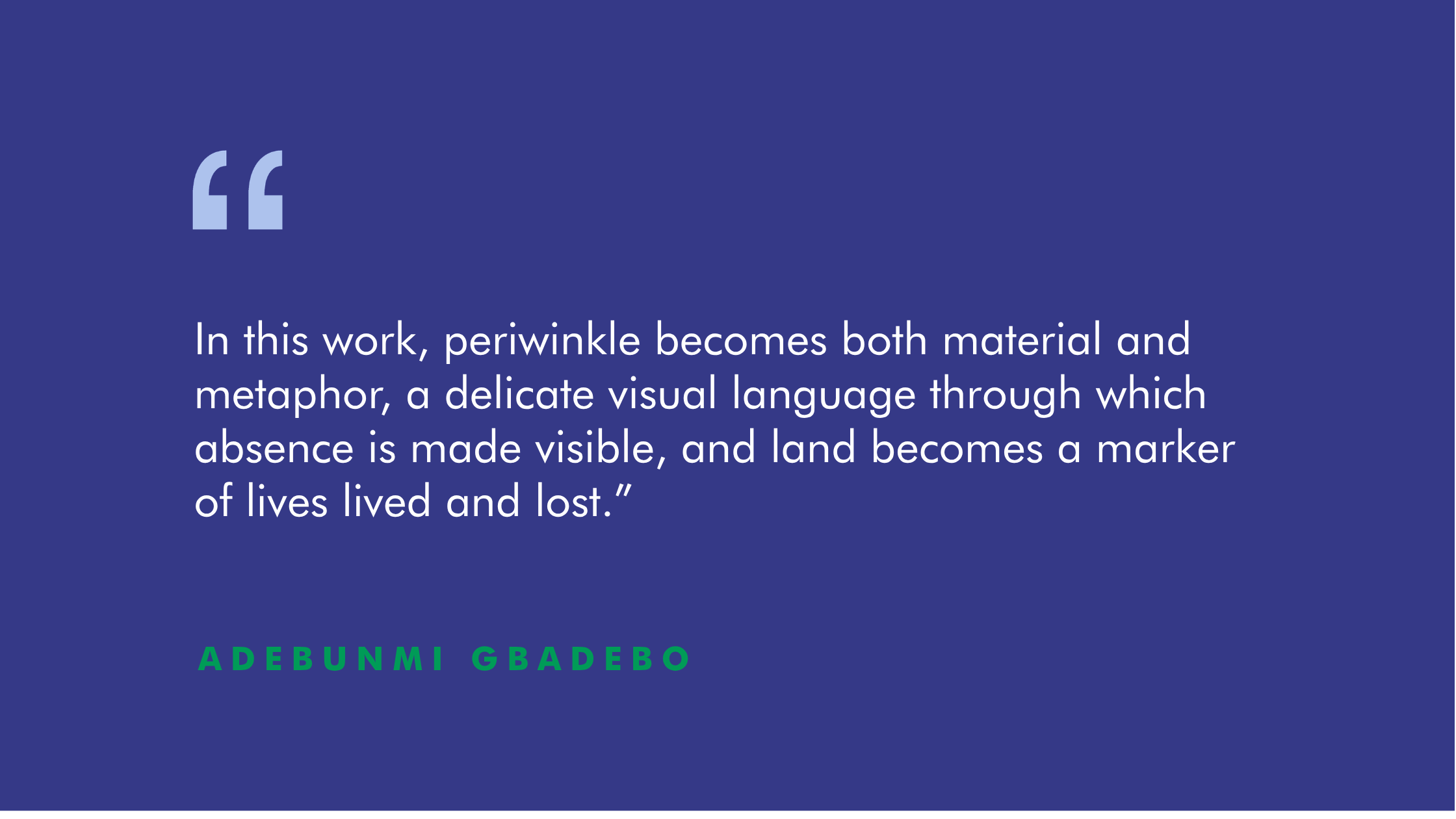 A single lithograph of a periwinkle bloom is collaged on top, camouflaged within the landscape, echoing how periwinkle operates in the wild: quiet, persistent, easy to miss, and impossible to ignore once seen. In this work, periwinkle becomes both material and metaphor, a delicate visual language through which absence is made visible and land becomes a marker of lives lived and lost.