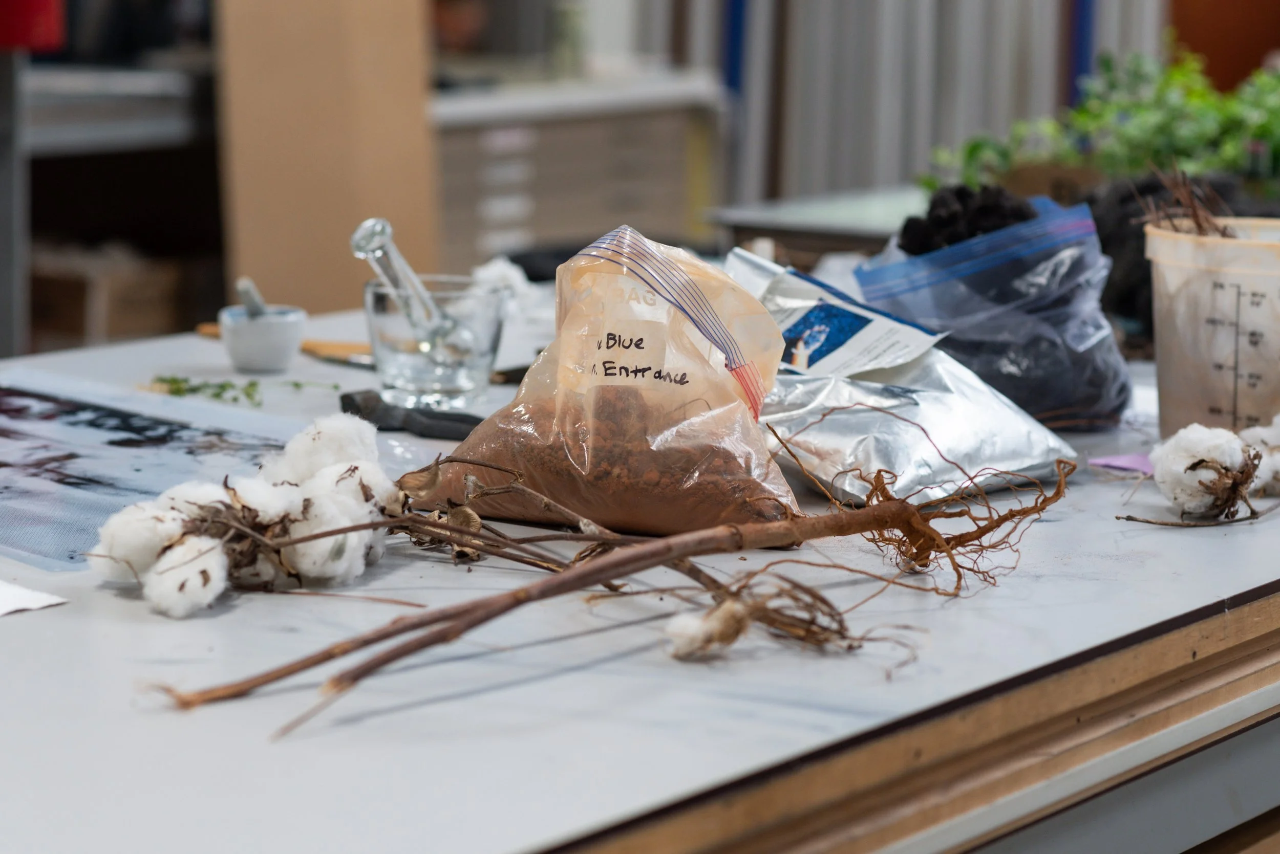 Grounded in historically and culturally significant materials such as indigo dye, human hair collected throughout the African diaspora and soil hand-dug from the True Blue plantation grounds in South Carolina, Gbadebo’s practice is an exploration of heritage. Her use of such materials centers her family history of enslavement in the American South, while her ceramics draw inspiration from traditional African pottery techniques, calling on her Nigerian ancestry. Fueled by research and a commitment to the archival record, Gbadebo’s multidisciplinary approach investigates the complex relationships between land, matter, and memory.